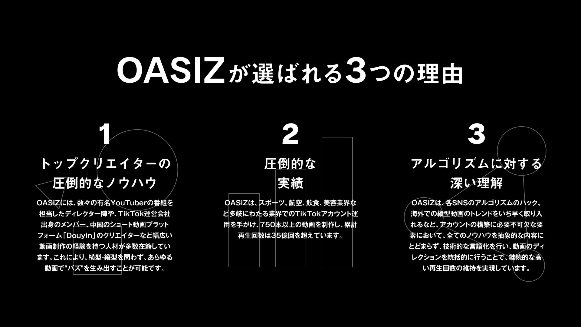 OASIZは、TikTokを中心とした“バズる”縦型動画に特化したクリエイティブ制作を行うネクストジェネレーションカンパニーです。TikTokアカウントの運用やコンサルティング、縦型動画広告の制作を行い、運用アカウントは50件以上、総再生数は35億回以上にものぼります。2023年7月25日には約2億円の資金調達を実施し、縦型動画界を盛り上げていくことに力をいれております。